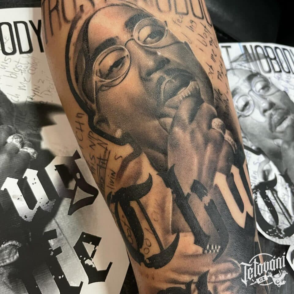 Tetování portrét osobnosti 2pac, nápisy na předloktí