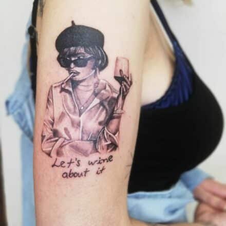 Tetování portrét osobnosti a nápisy, citát na rukáv