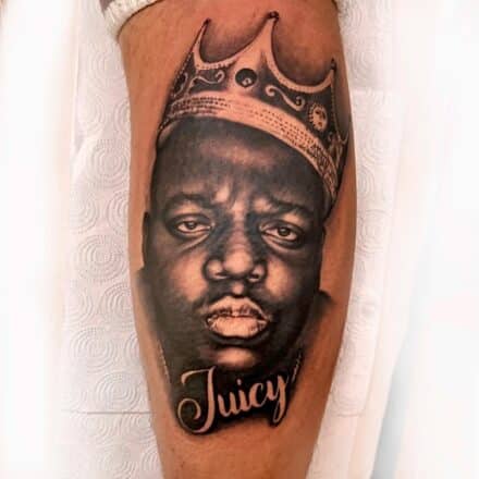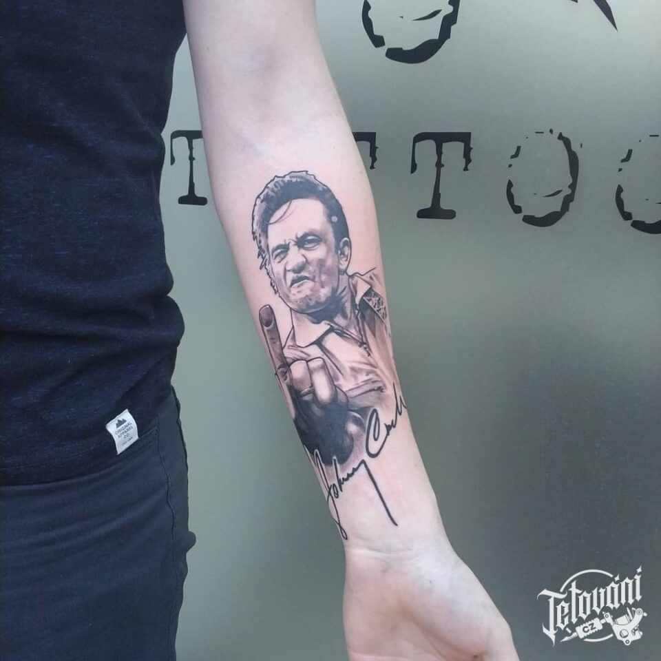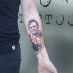 Tetování portrét osobnosti a nápisy, jméno na předloktí