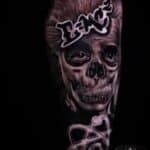 Tetování portrét osobnosti a nápisy, písmena na rukáv