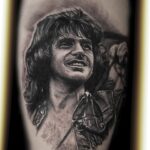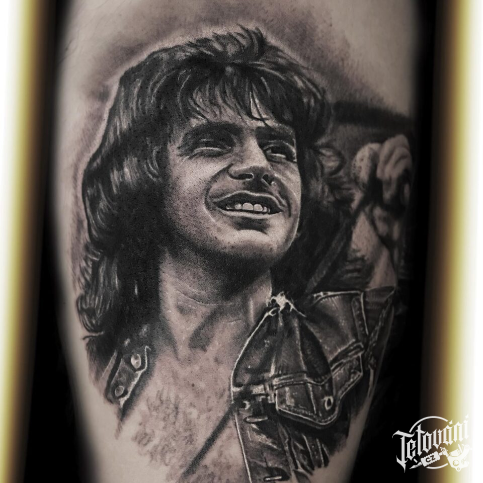 Tetování portrét osobnosti Bon Scott, hudba, na lýtko