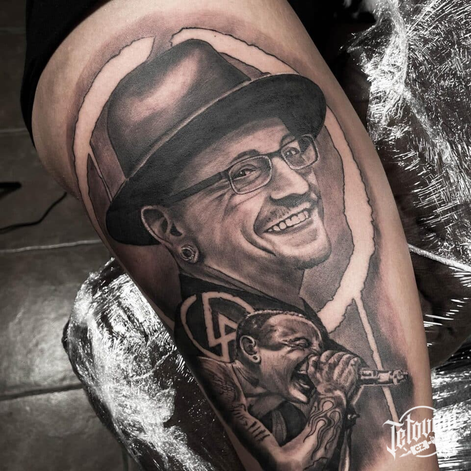 Tetování portrét osobnosti Chester Bennington, hudba na stehno