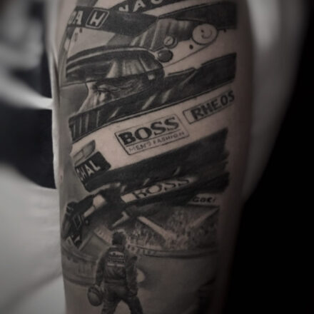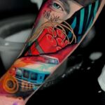 Tetování portrét osobnosti Eminem, dopravní prostředek auto na předloktí