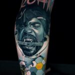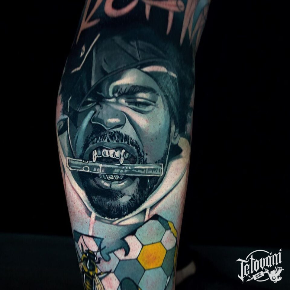 Tetování portrét osobnosti, hudba, včela, nápisy na lýtko