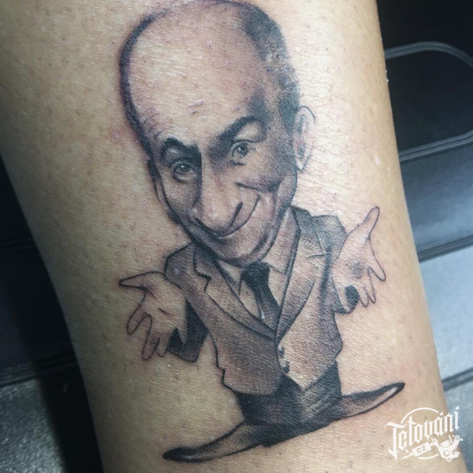 Tetování portrét osobnosti Louis de Funès na lýtko