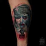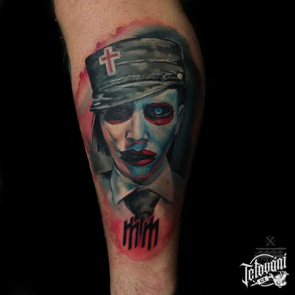 Tetování portrét osobnosti Marilyn Manson na lýtko