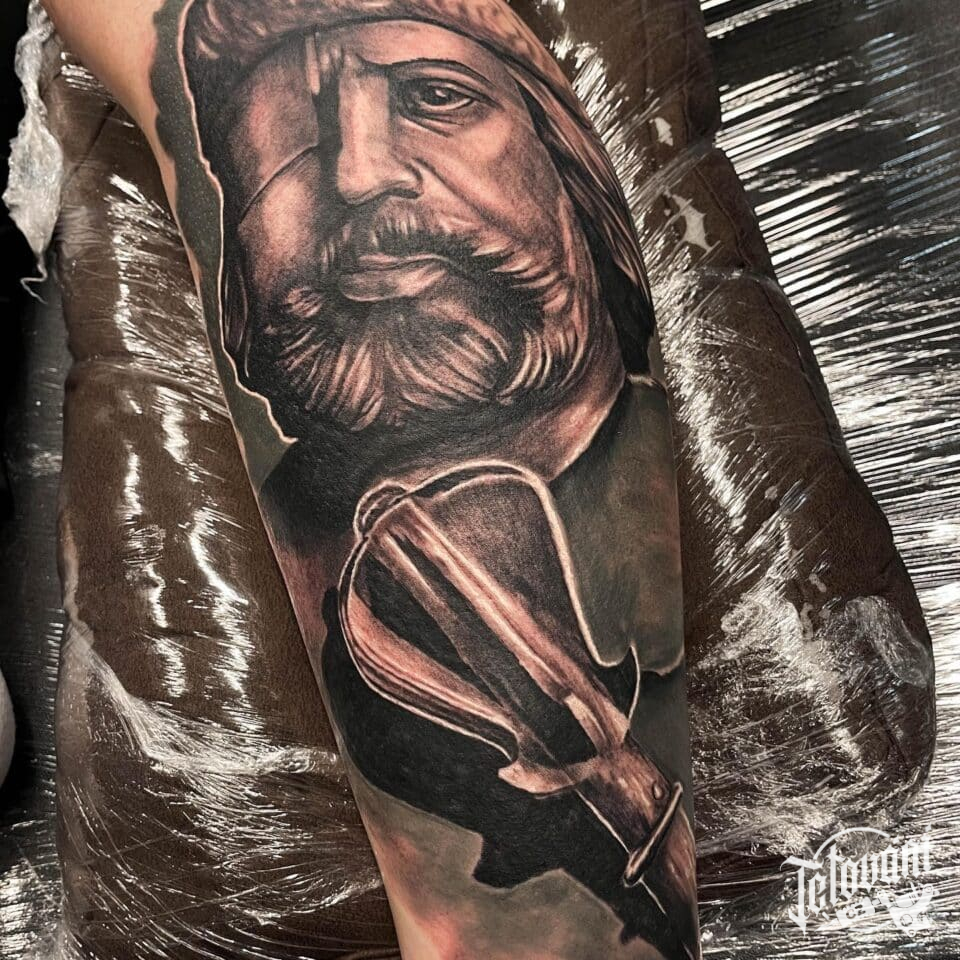 Tetování portrét osobnosti na lýtko