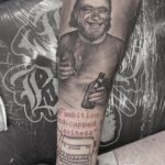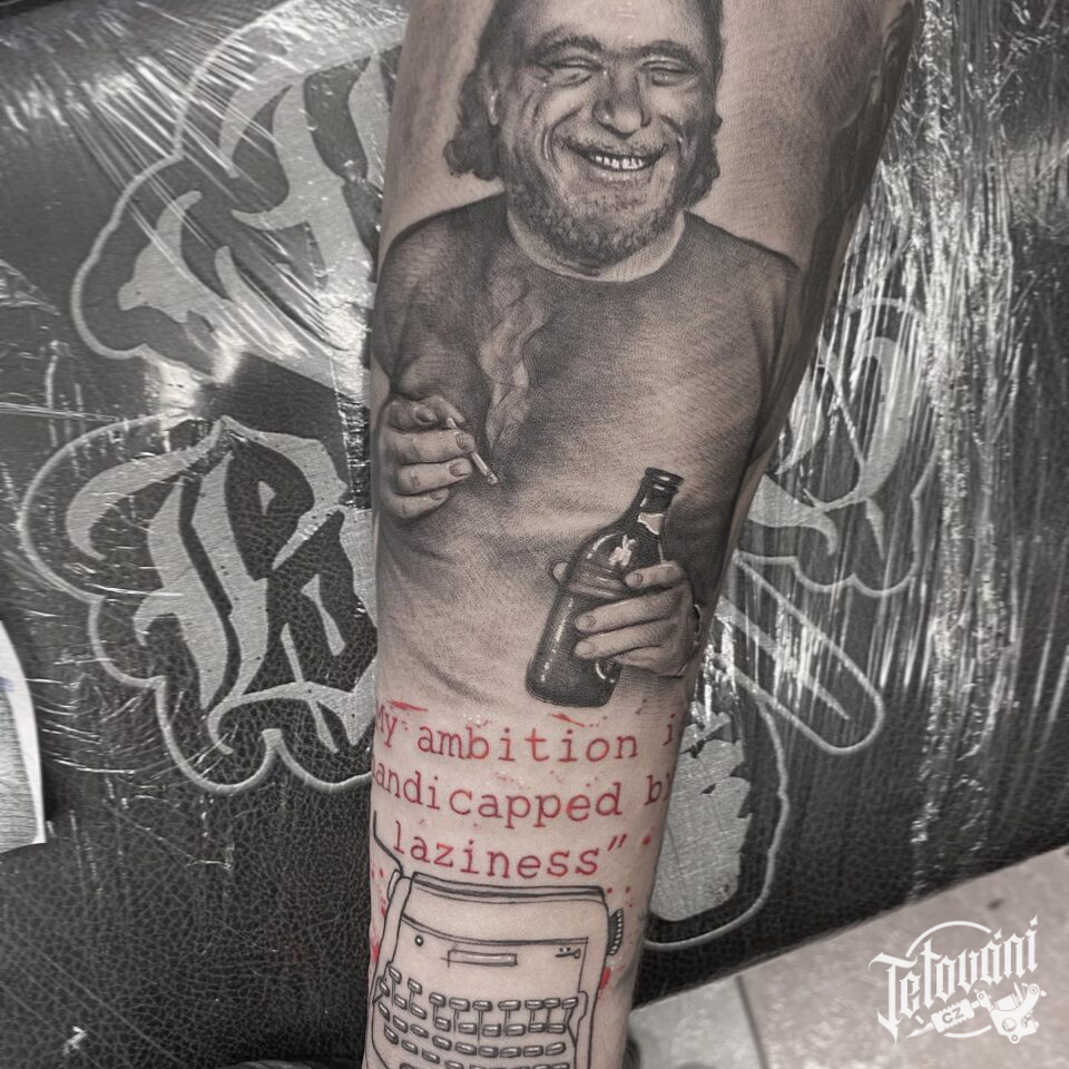 Tetování portrét osobnosti, nápisy a znaky a symboly symbol na předloktí