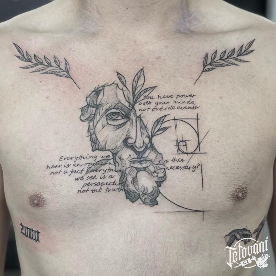Tetování portrét osobnosti řecký matematik Eukleidés, citýty na hrudník