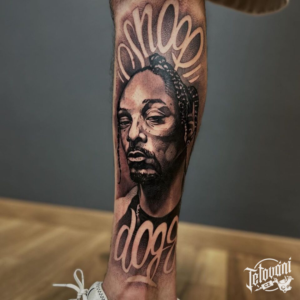 Tetování portrét osobnosti Snoop Dog, nápisy na lýtko