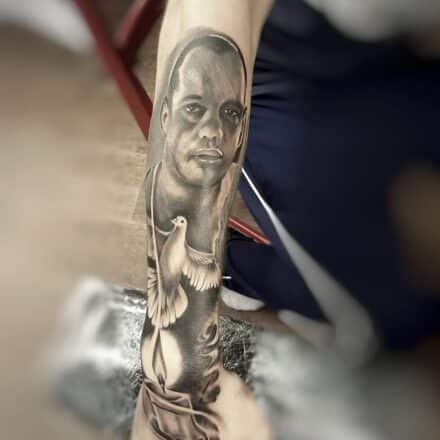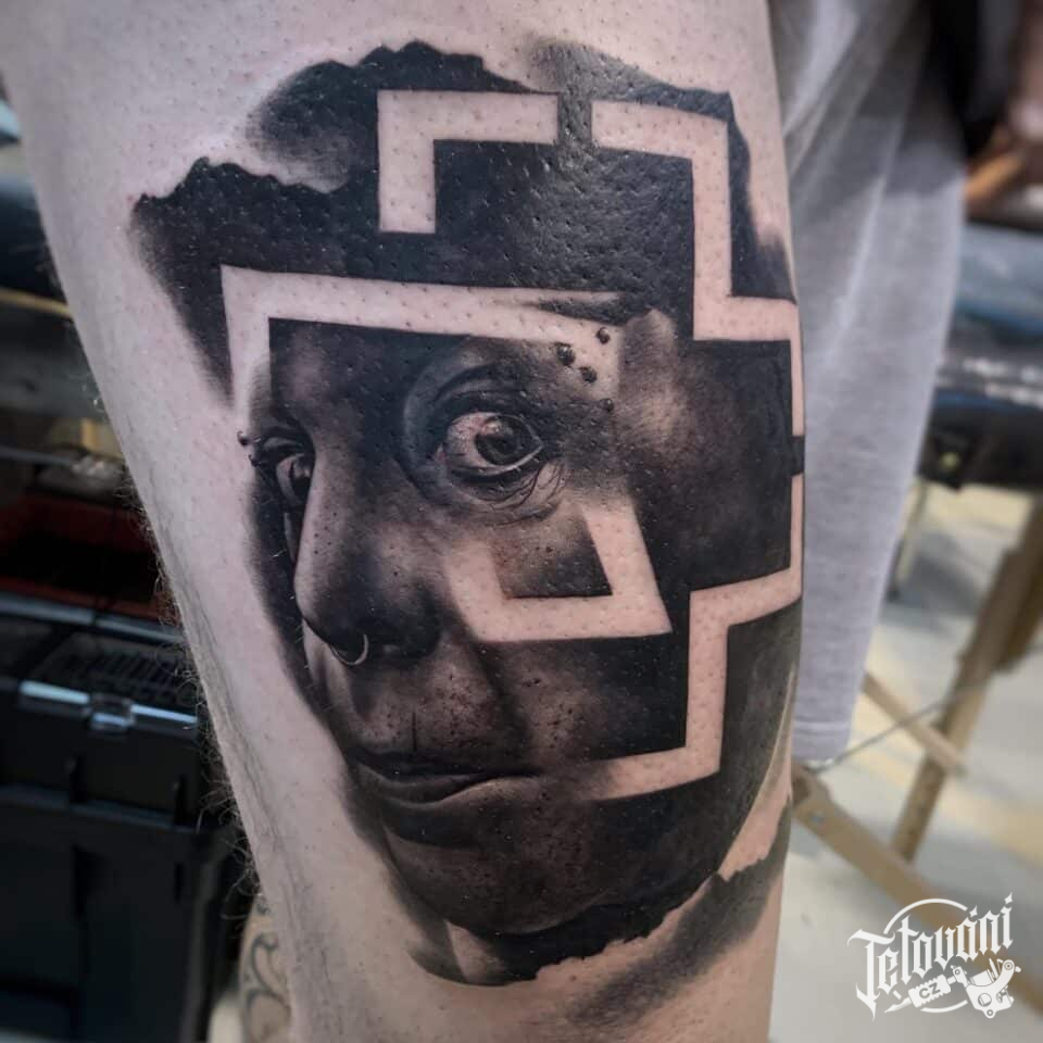 Tetování portrét osobnosti Till Lindemann na stehno