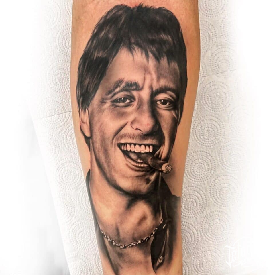 Tetování portrét osobnosti Tony Montana na předloktí