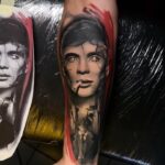 Tetování portrét osobnosti z filmů a pohádek, barevné čáry na předloktí