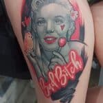 Tetování portrét osobnosti, zvířata, pták a nápis na stehnu
