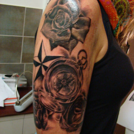 Tetování portrét Panny Marie, hodiny kapesní, rukáv