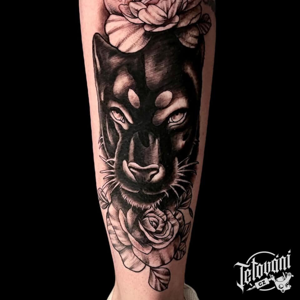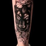 Tetování portrét pumy, květiny, růže na lýtko