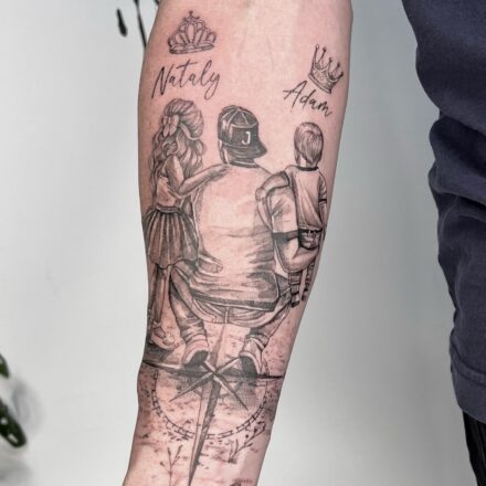 Tetování portrét s medvědem a dítětem na lýtku