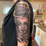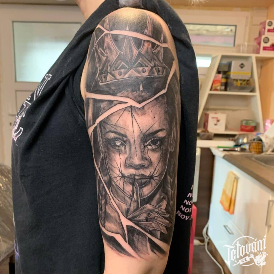 Tetování portrét s korunou na rameni