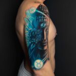 Tetování portrét s květinou na rameni