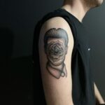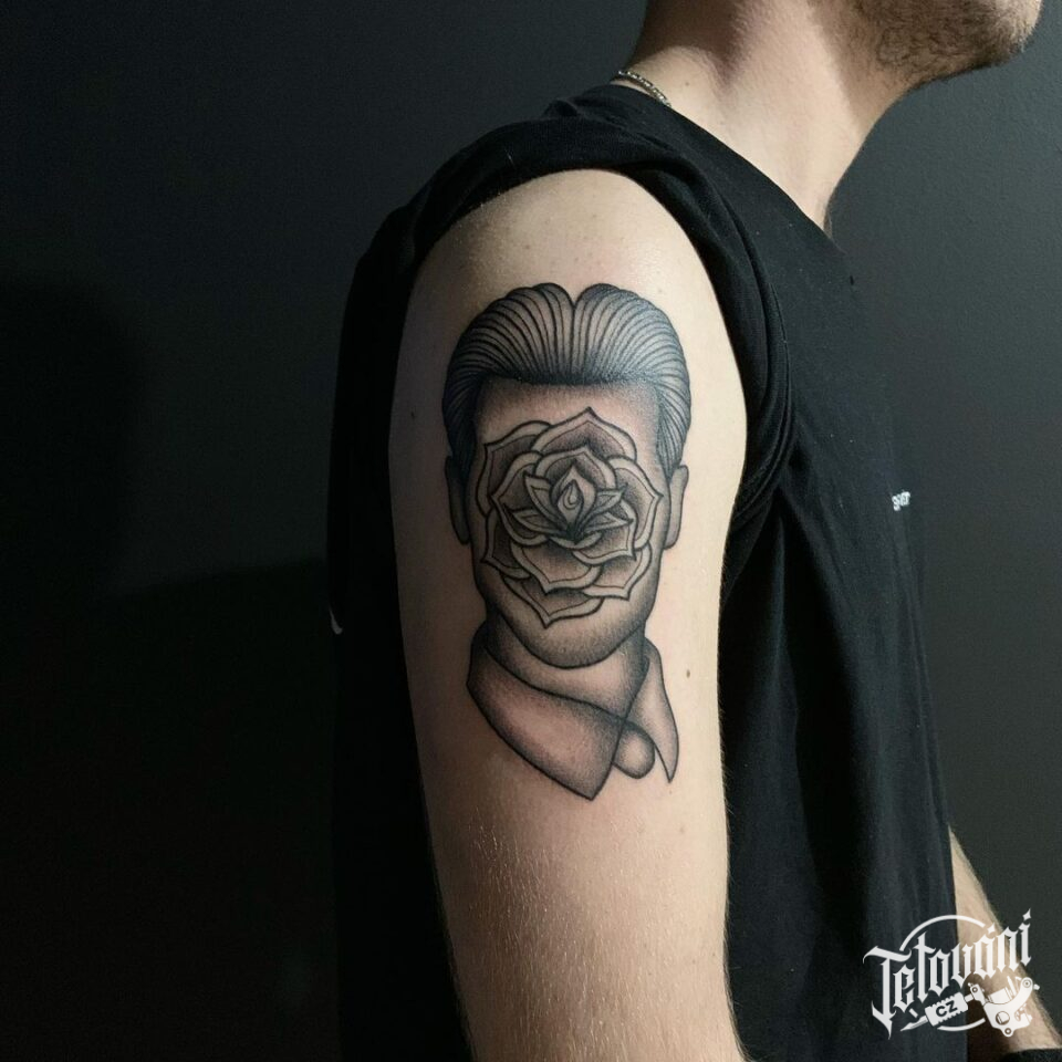 Tetování portrét s květinou na rameni