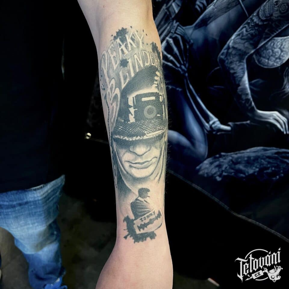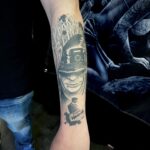 Tetování portrét s nápisem na předloktí