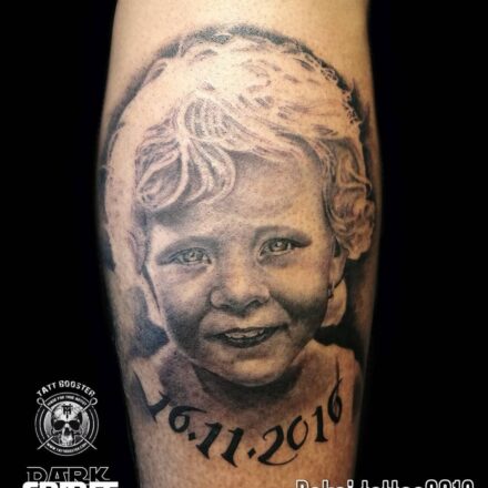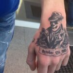 Tetování portrét s nápisem, s datem na hřbetu ruky