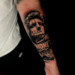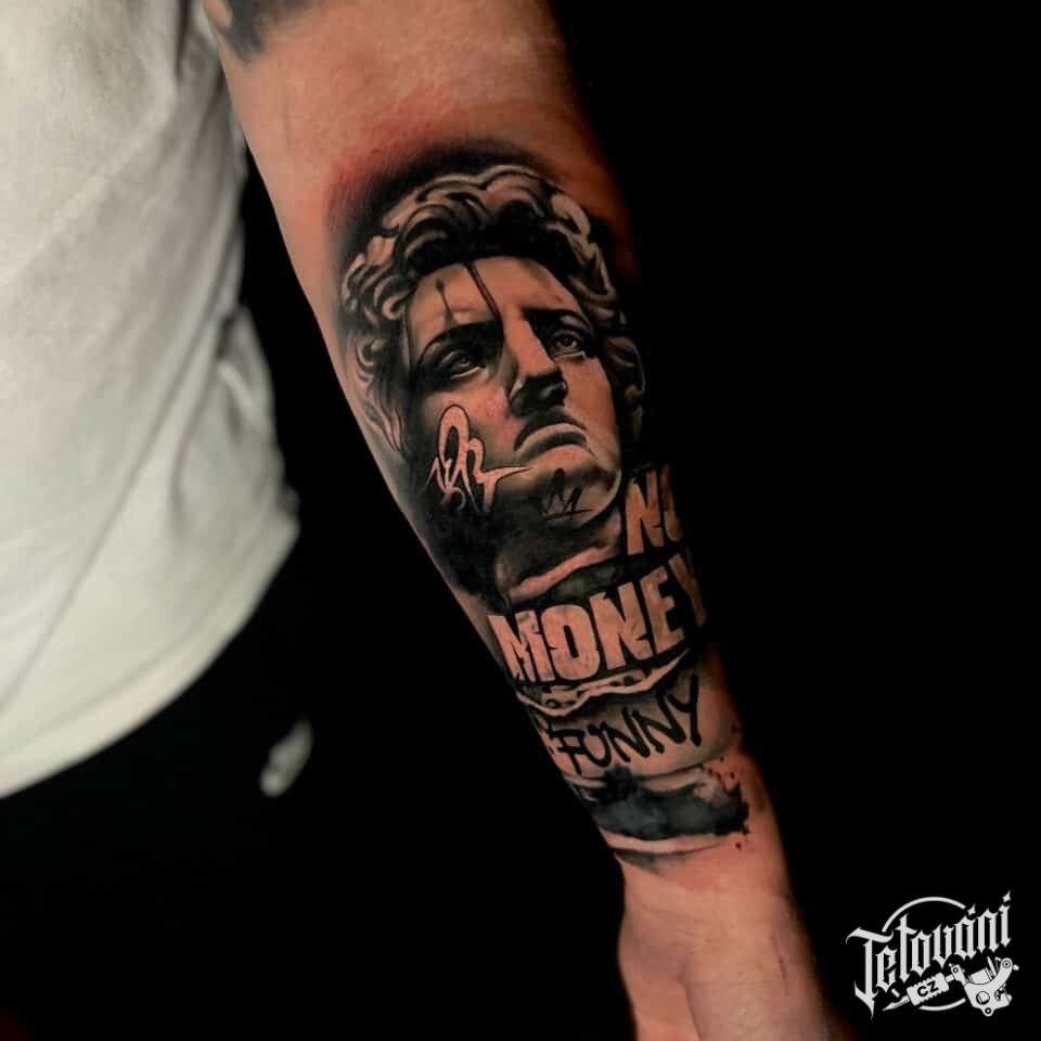 Tetování portrét s nápisy na předloktí