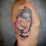 Tetování portrét s nápisy na rameni