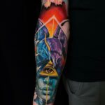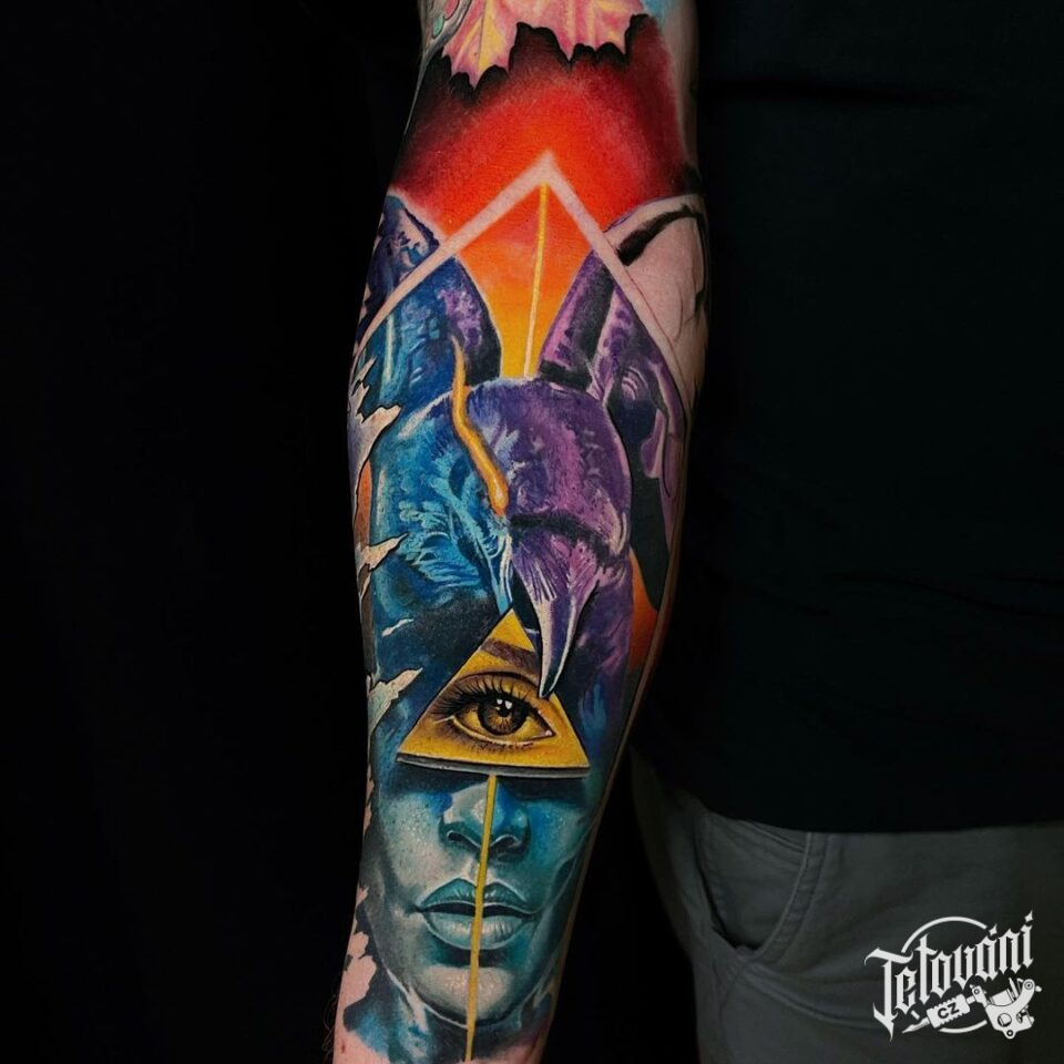 Tetování portrét s okem, zvíře, pták, havran na předloktí