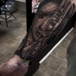 Tetování portrét samuraj a katana meč na předloktí
