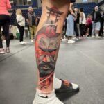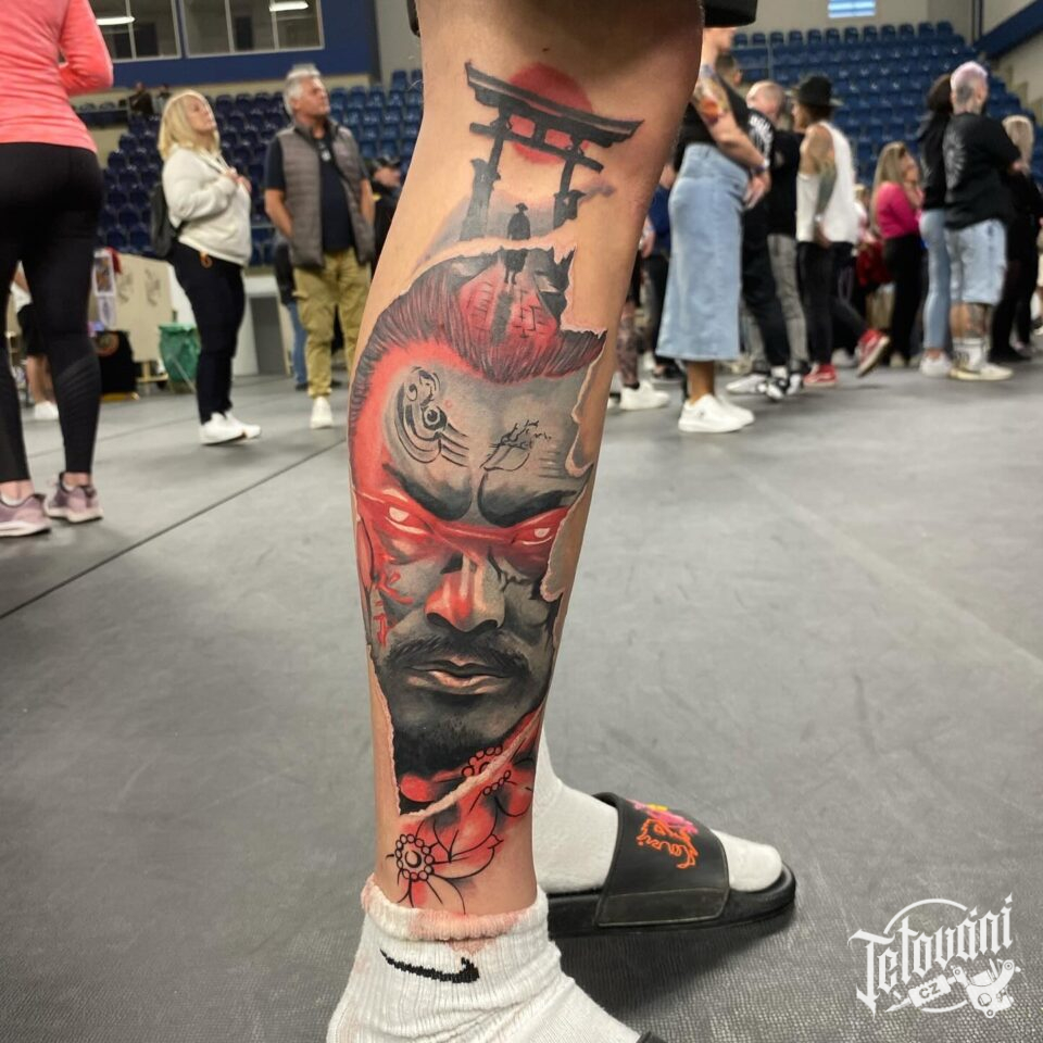 Tetování portrét samuraje na lýtku