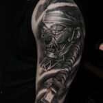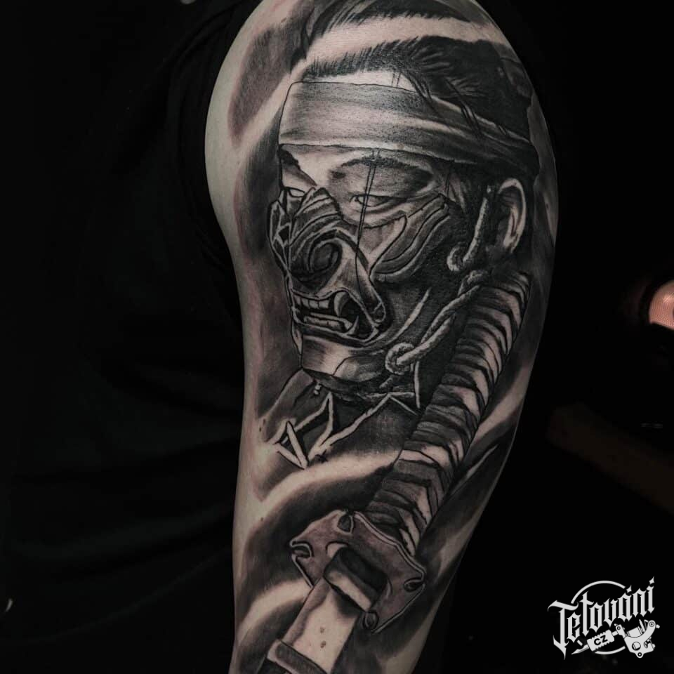 Tetování portrét samuraje s mečem na rameno