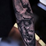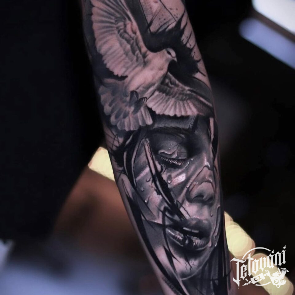 Tetování portrét smutku a zvíře pták na předloktí