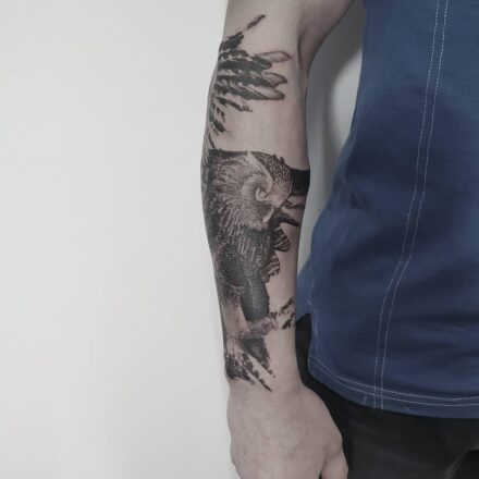 Tetování portrét, sova, zvíře na rameno