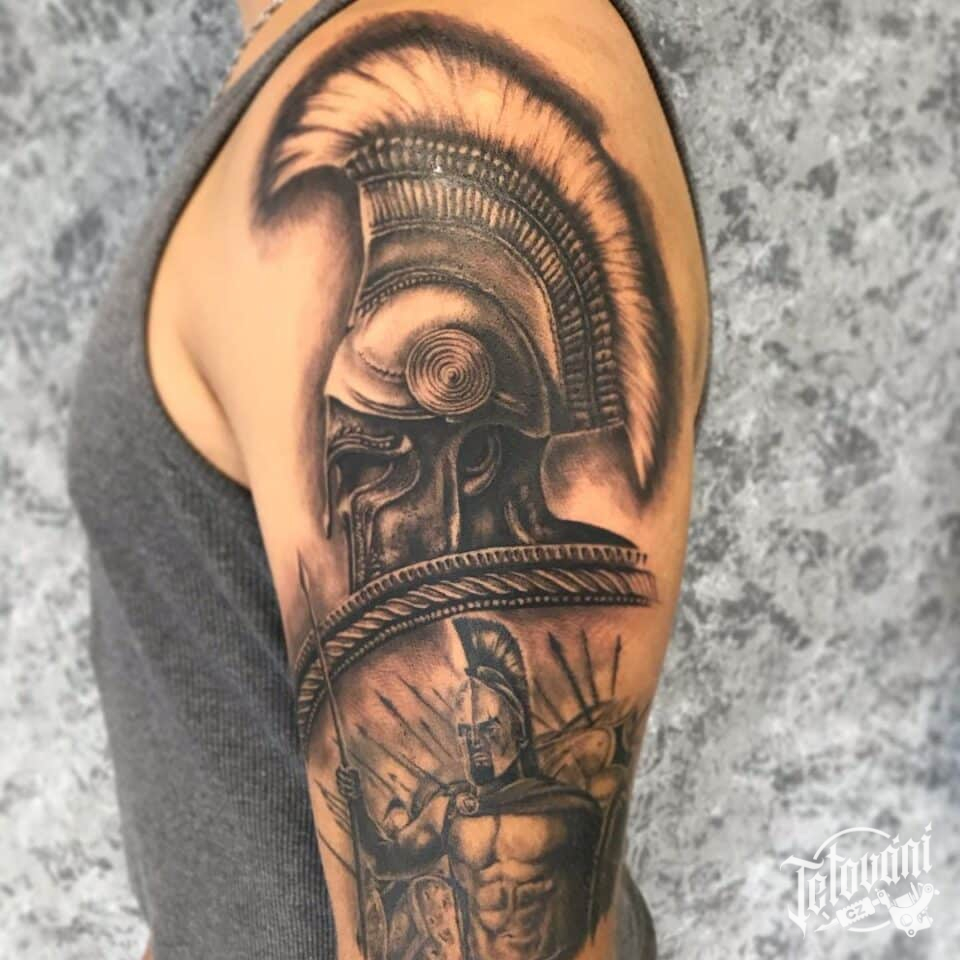 Tetování portrét sparťanského bojovníka, symbol síly na rameno