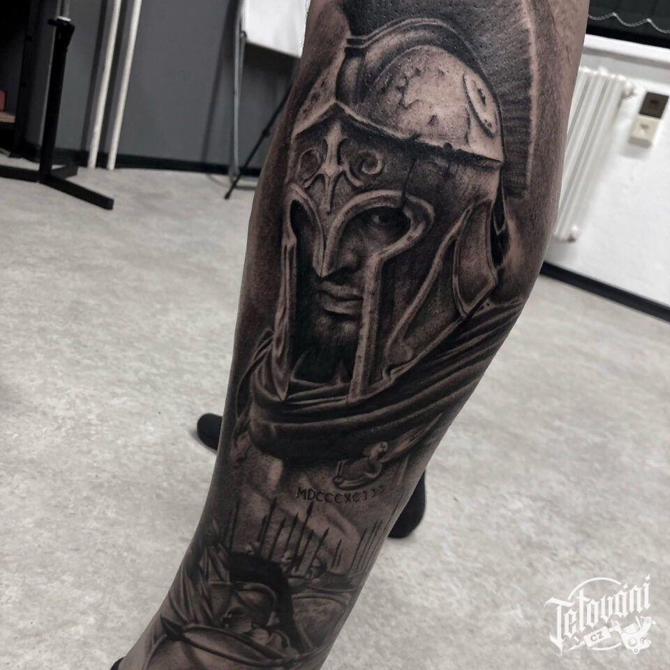 Tetování portrét, sparťanský bojovník na lýtku