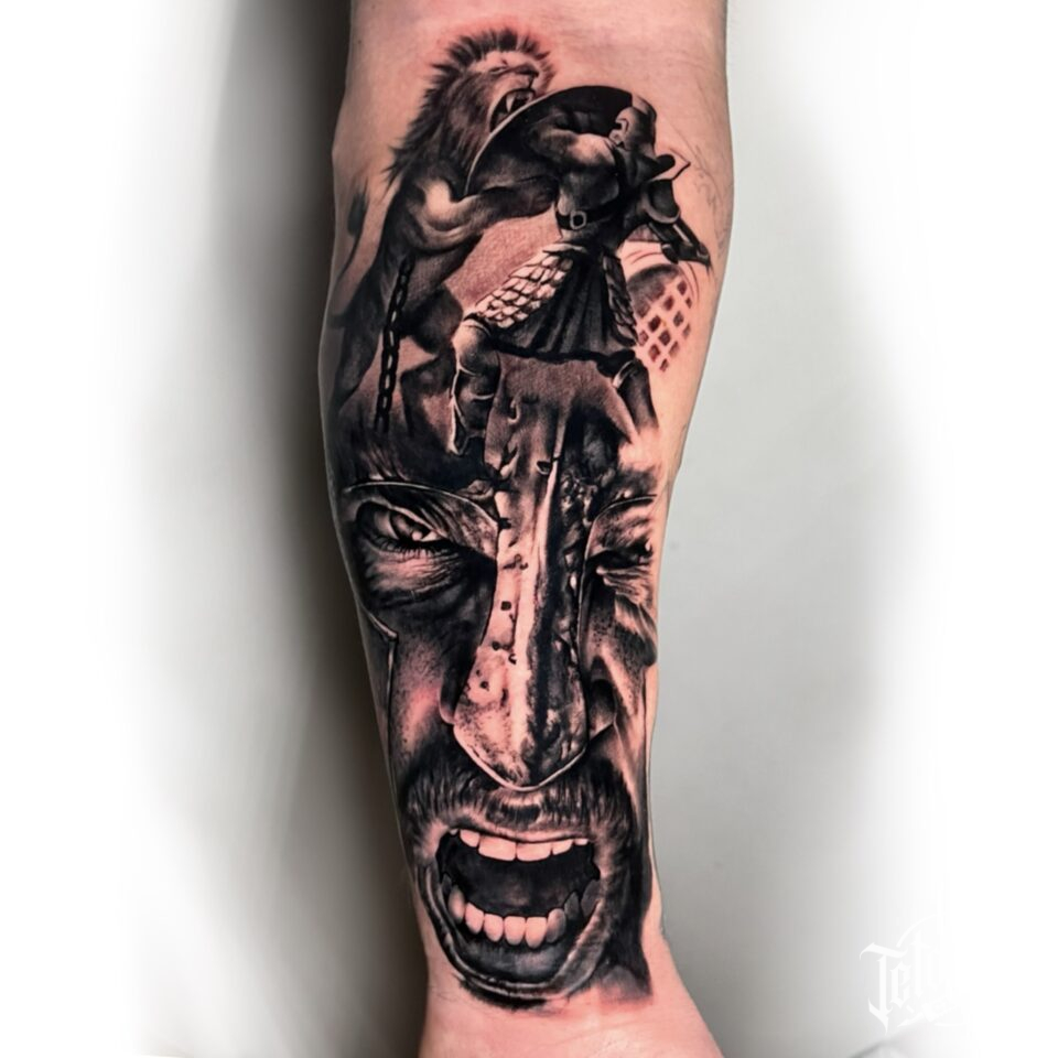 Tetování portrét, sparťanský bojovník na předloktí