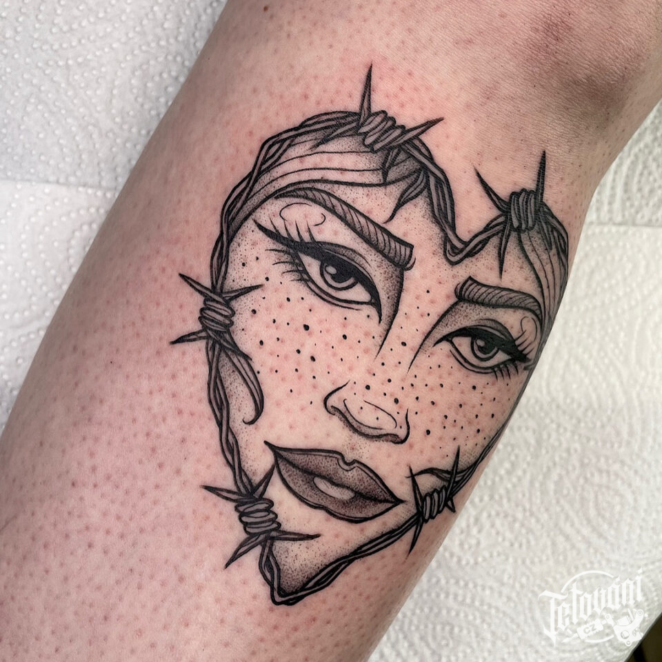 Tetování portrét, srdce s ostnatým drátem na holeni