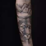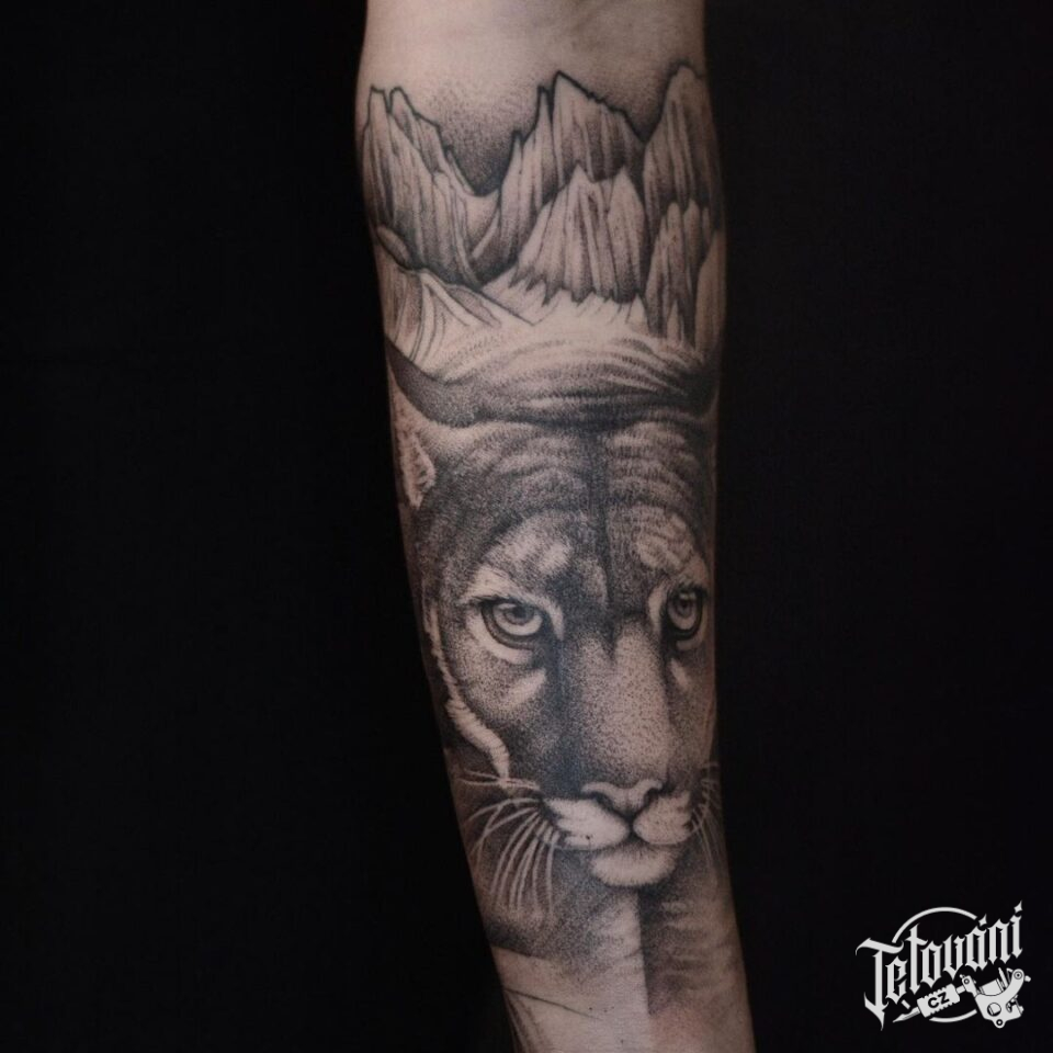 Tetování portrét tygra, příroda, hory na předloktí