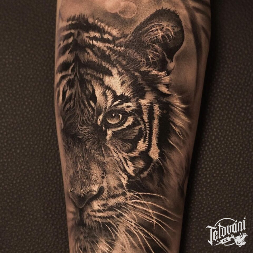 Tetování portrét tygra, zvíře na předloktí