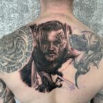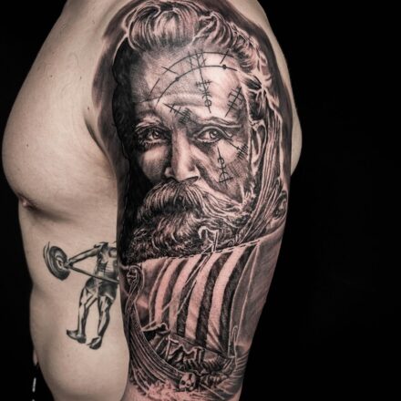 Tetování portrét vikinga, runa ochranné symboly na zádech