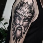 Tetování portrét vikinga, symbol přírody na rameni