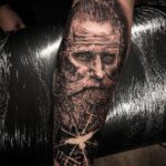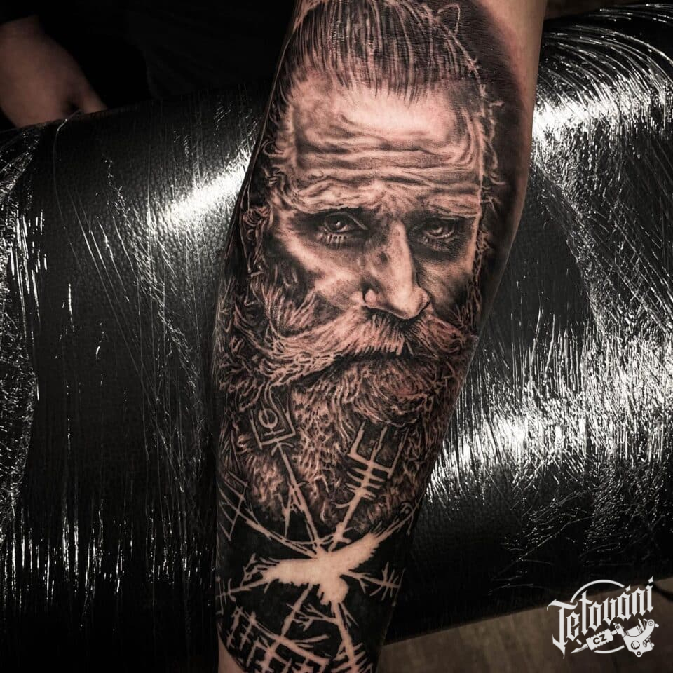 Tetování portrét vikingského bojovníka, severské tetování a runa ochranné symboly na předloktí