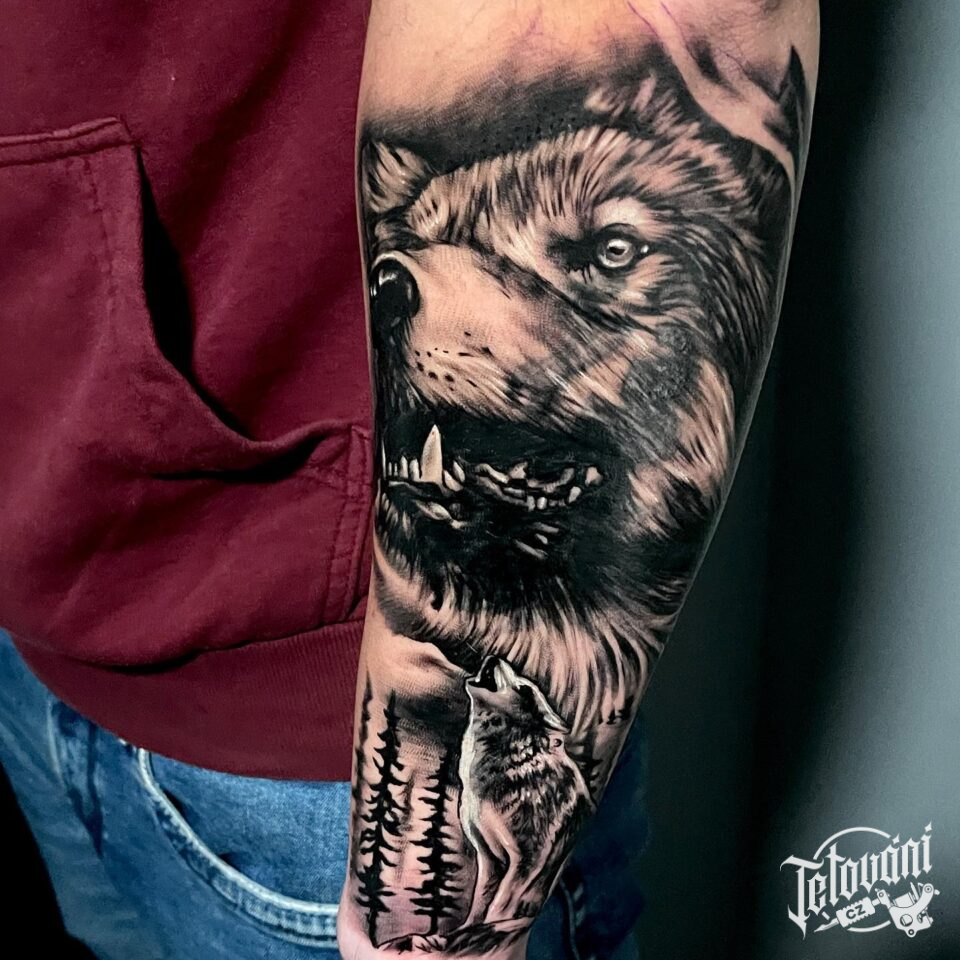 Tetování portrét vlka, příroda, les, zvíře na předloktí
