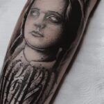 Tetování portrét z filmů a pohádek Adamssova rodina, dítě, nápis na lýtko