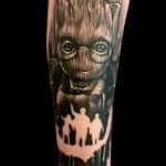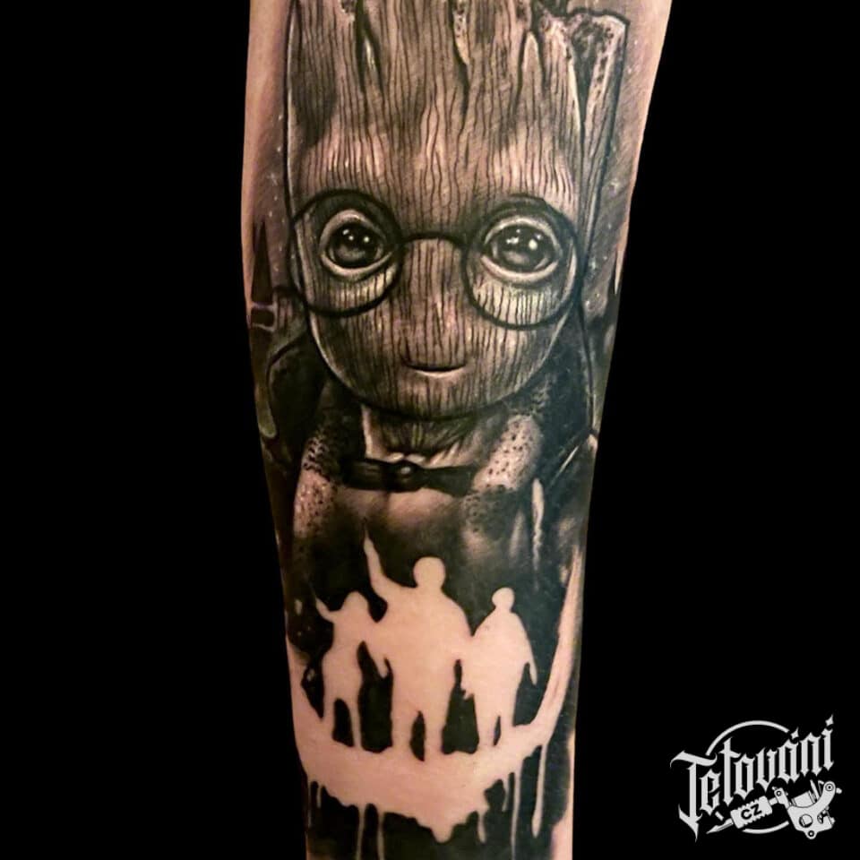 Tetování portrét z filmů a pohádek Avengers, Marvel, postavička Groot na předloktí