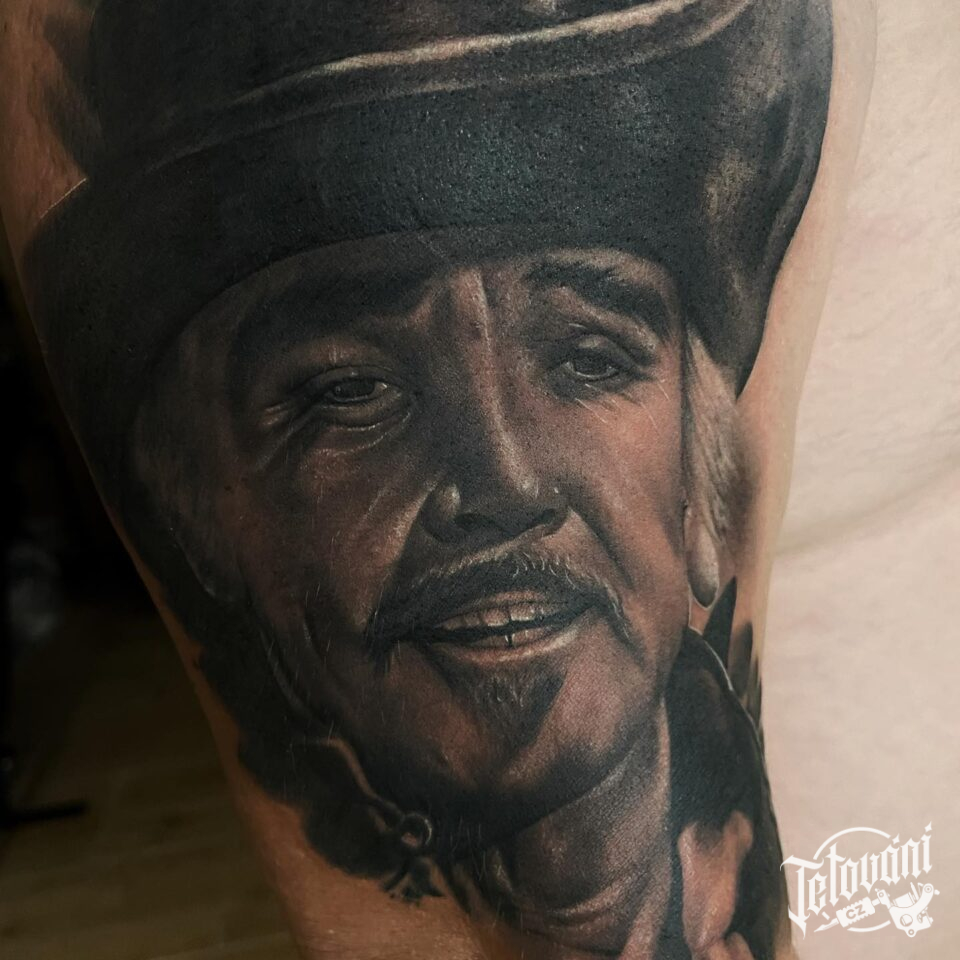 Tetování portrét z filmů a pohádek Highlander Ramirez na bok stehna