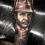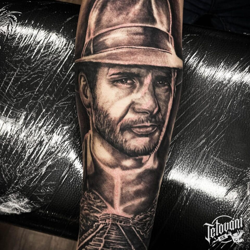Tetování portrét z filmů a pohádek Indiana Jones na předloktí