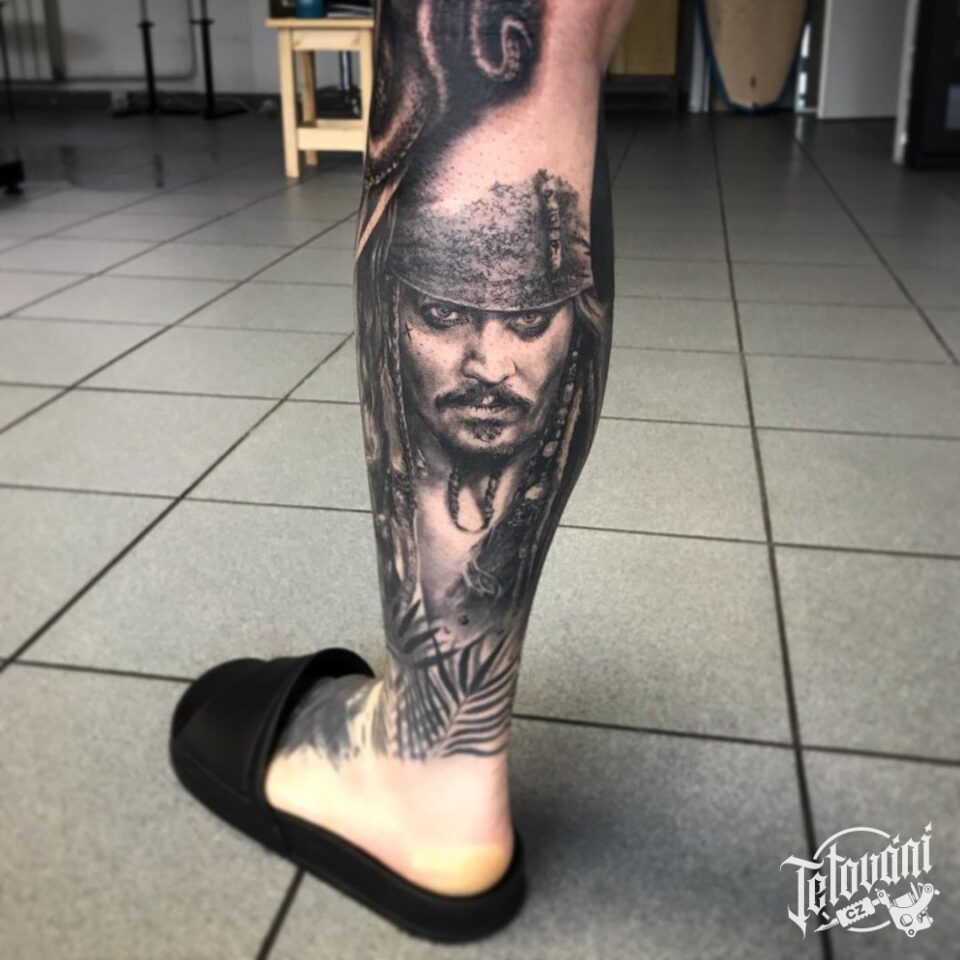Tetování portrét z filmů a pohádek, Jack Sparrow na lýtko