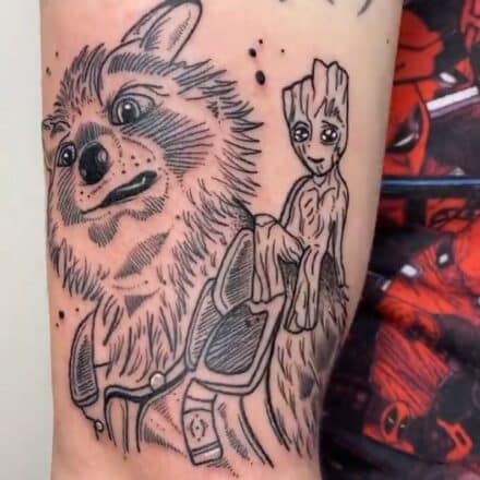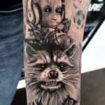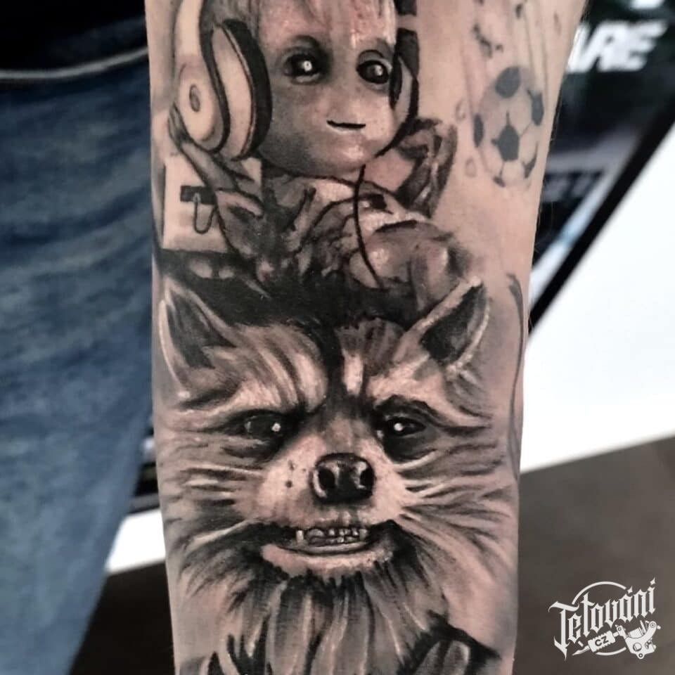 Tetování portrét z filmů a pohádek Marvel, postavičky Groot a Rocket na předloktí